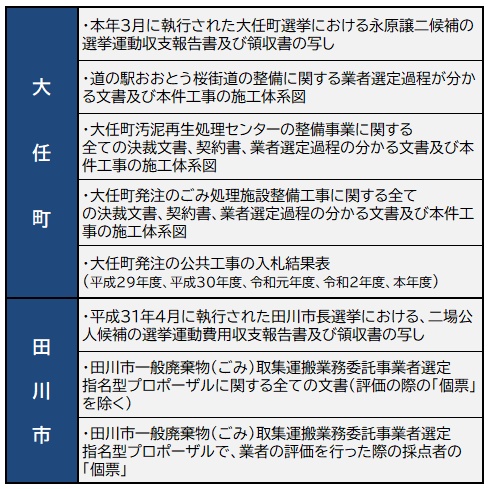 首長選挙における収支報告書は、初めて取材する自治体において必ず取得するのがハンターの決まり。投開票から3年以内なら選管が保有しており、同年3月に5期目の当選を果たしていた永原譲二大任町長と2019年に再選された二場公人田川市長(当時)の選挙運動費用収支報告書は開示請求が可能だった。