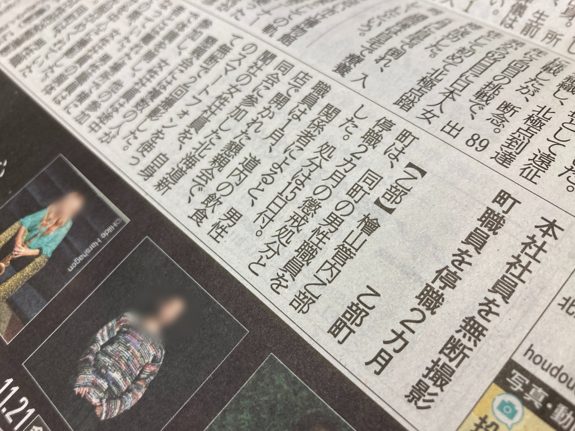盗撮事件は、本年1月初旬の深夜から未明にかけて発生。町職員ら30人あまりが集まった飲食の席で、参加者に請われて顔を出していた道新の女性記者が被害に遭った。酩酊して前後不覚になった女性記者の衣服の裾が乱れて下着が見えている姿を、町建設課に勤務する60歳代の男性職員がスマートフォンで2度、無断で撮影したという。