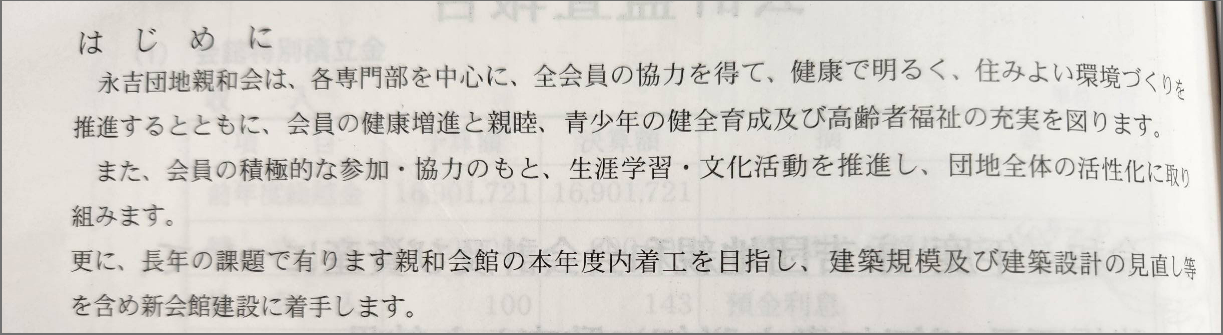 伊地知氏は、昨年の総会で会館建替え計画の承認を得たと主張する。根拠となっているのは毎年度の自治会総会で配布される「定期総会 議案書」(*下の画像参照)。市の担当課長が「コミュニティセンター建設を決議したとする総会資料」がこれにあたるとみられる。