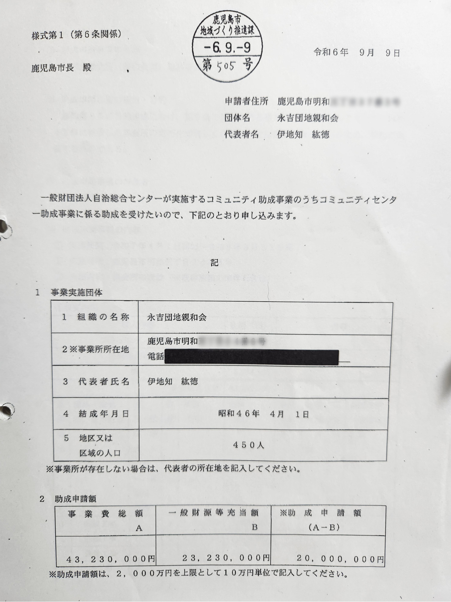 問題の集会所は、鹿児島市明和の永吉団地にある「親和会館」。老朽化に伴い、建設費約4,300万円をかけるという建替え計画が進行中だ。事業費の半分近くを占めるのが2,000万円にのぼる「コミニュティ助成金」。伊地知紘徳市議会議員が代表を務める自治組織「永吉団地親和会」が、事業を所管する市地域づくり推進課に助成金の申請書を提出していた。(*下が申請書の表紙。次の画像、赤いアンダーラインが添付書類を示した箇所)