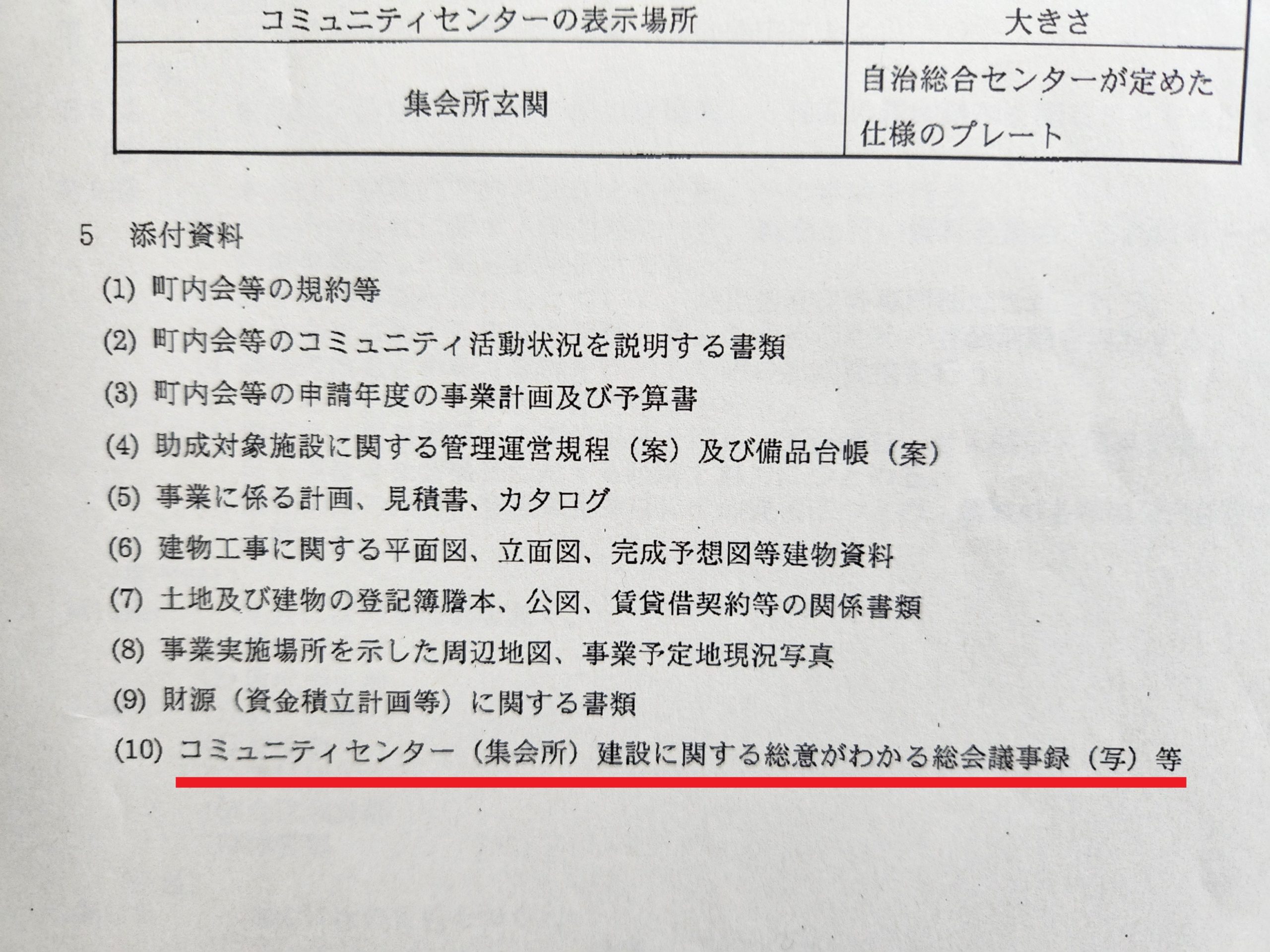 記者が注目したのは、添付書類の中の《コミュニティセンター(集会所)建設に関する総意が分かる議事録(写)等》である。住民の総意が示されたことを証明する議事録の写しが提出されたことになっている。