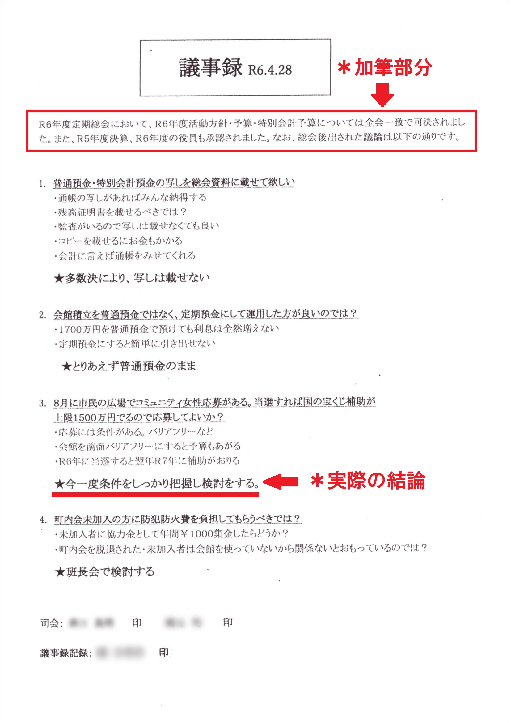 不正を感じ取った住民らがさらなる議事録の開示を求めたのは言うまでもない。そうした声を無視できなかったらしく、4月13日に開かれた自治会年次総会の終了後に伊地知市議が出してきたのが下の「議事録 R6.4.28」である。