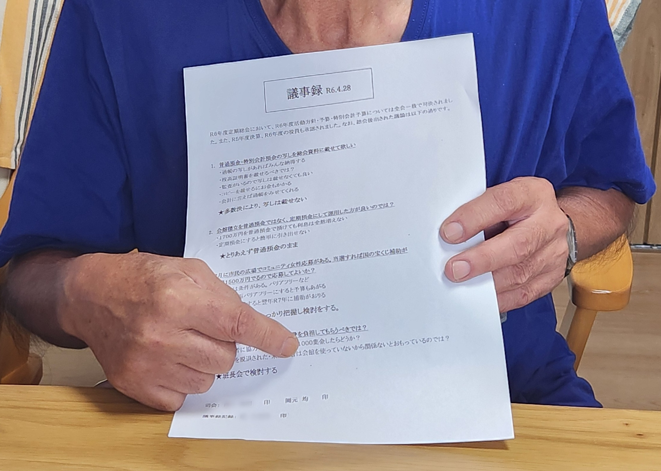 問題は、「議事録署名人による署名と押印」とみられる記述である。《議事録記録》の人物の氏名の後には、薄いながら押印があるのだが、司会ともう一人の人物の氏名は印字されているだけで、押印がない。ハンターは氏名が記載されていた岡元均さんに会い、経緯を確認した(*下、議事録の署名部分を指し示しているのが岡元さん)。