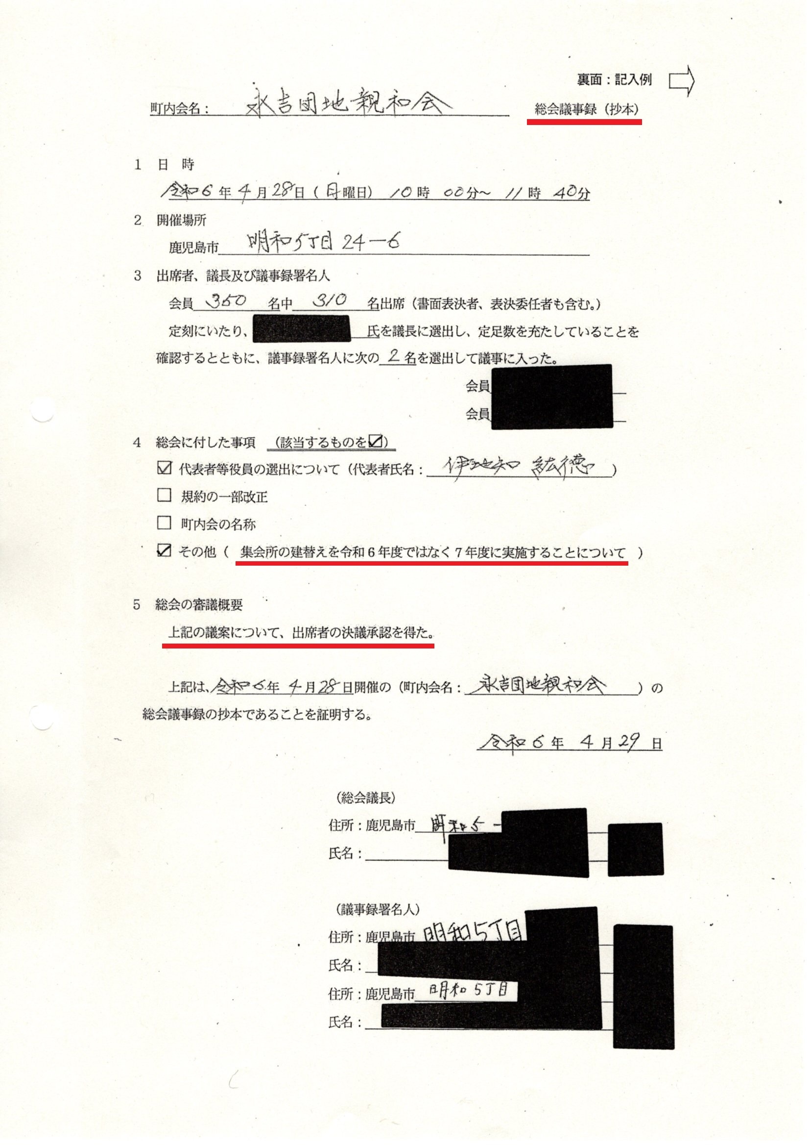 鹿児島市明和にある集会所「永吉団地 親和会館」の建替え計画を進めるため、地元の自治組織「永吉団地親和会」が市に助成金の申請を行った際、同会の代表を務める伊地知紘徳市議会議員が、地元の同意に関する事項を偽った総会議事録を作成し、提出していた(既報)。取材の過程で、議事録原本の重要部分を切り取って住民に見せたり、作成し直して都合よく加筆するなど幼稚な手口も判明。さらに直近の取材で、議事録原本にある「議事録署名人」の氏名が、本人に承諾なく勝手に使われていたことまで明らかとなった。議事録偽造による虚偽申請の疑いが濃いが、同市議と市の所管課である地域づくり推進課は疑惑を無視して計画を進める構えだ。