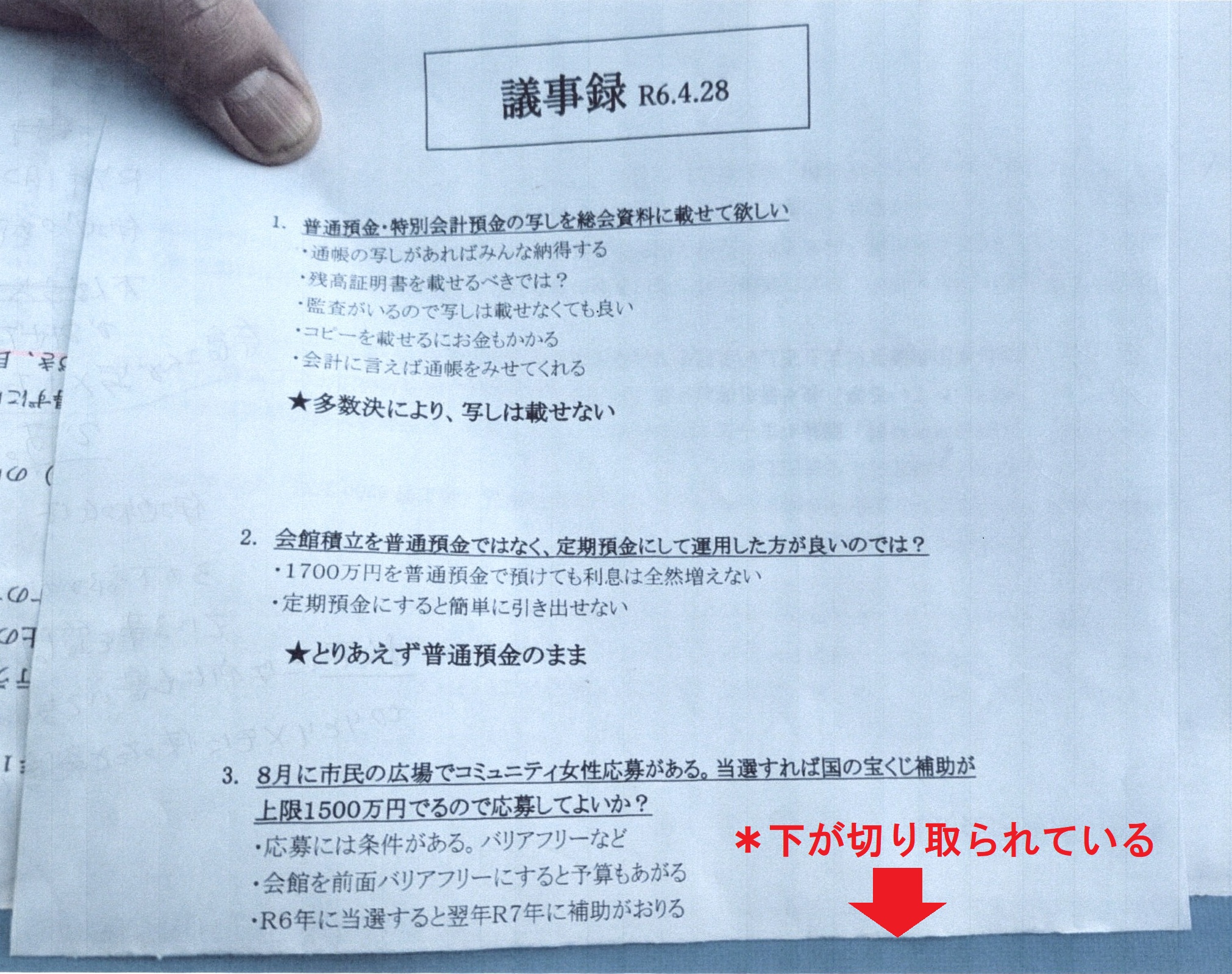 これに対して、伊地知市議が住民の求めに応じて今年1月に示した議事録原本は、紙面の下を切り取った不十分なものだった(*下の画像)。“場所、会員数、出席者数、総会開催の目的”といった必要事項の記載はなく、かろうじて“議事の経過の概要と結果”と思しき記述がある程度。“議事録署名人の選任に関する事項”と“議事録署名人の署名と押印”は確認できない。