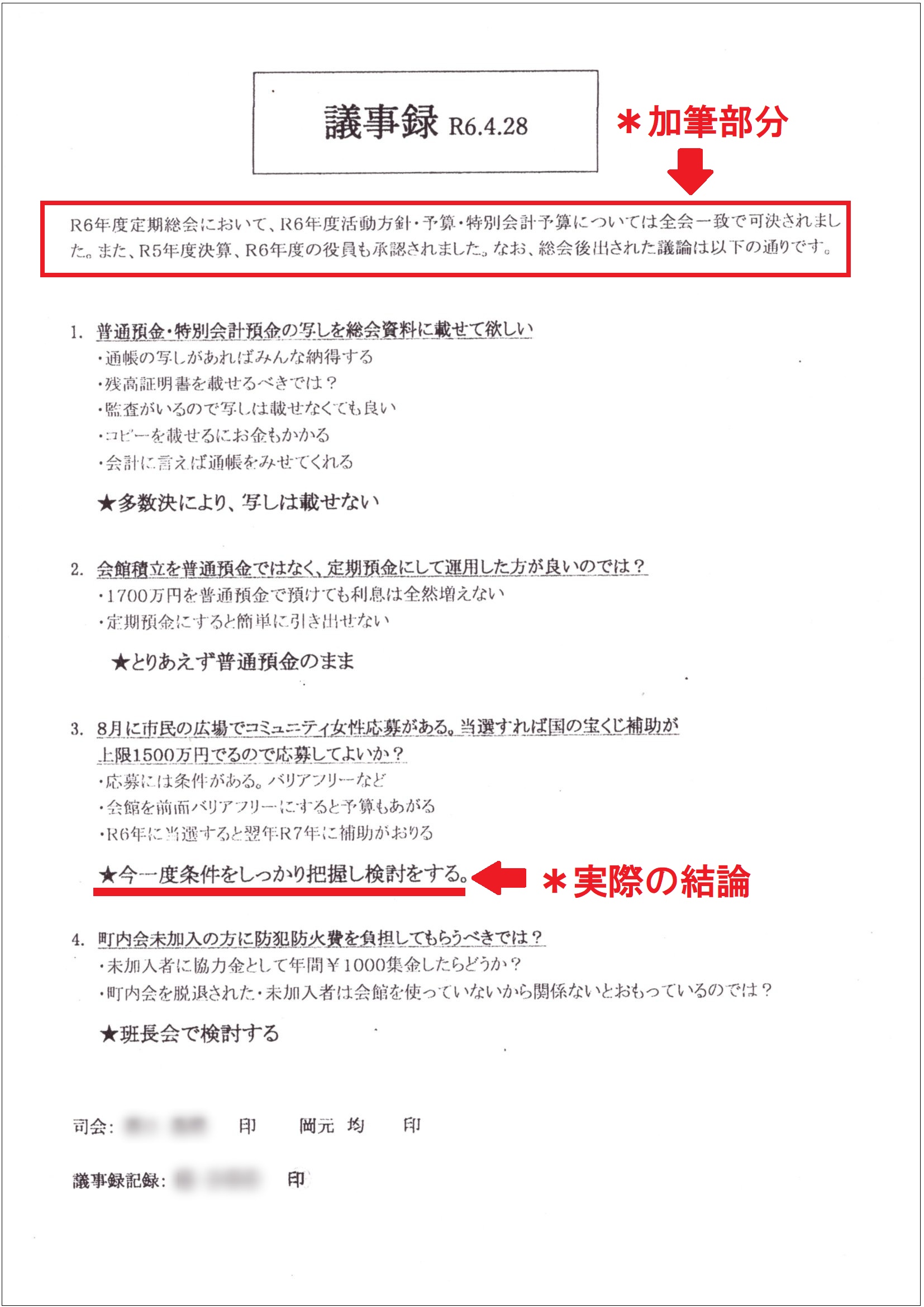 「何も書いていなかったから切ってメモに使った」と言う伊地知氏に不信感を抱いた住民らが追及した結果、4月の自治会総会後に同市議が出してきたのが下の「議事録」である。