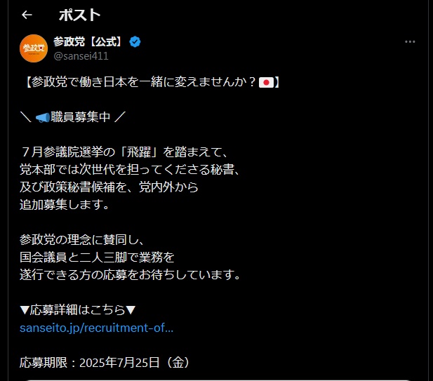 そのA氏が、スマートフォンの画面を見せくれた。参政党がSNSのアカウントから《【参政党で働き日本を一緒に変えませんか?】職員募集中7月参議院選挙の「飛躍」を踏まえて、党本部では次世代を担ってくださる秘書、及び政策秘書候補を、党内外から追加募集します》と公設秘書を「公募」している内容だ(*下の画像)。