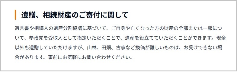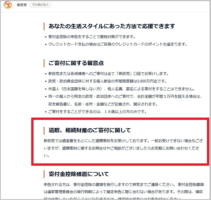 「遺贈、相続財産のご寄付に関して」というホームページ上の記載がSNSで炎上している。問題のホームページは参政党のもの。全文は以下の通りだ(*赤い囲みはハンター編集部)。