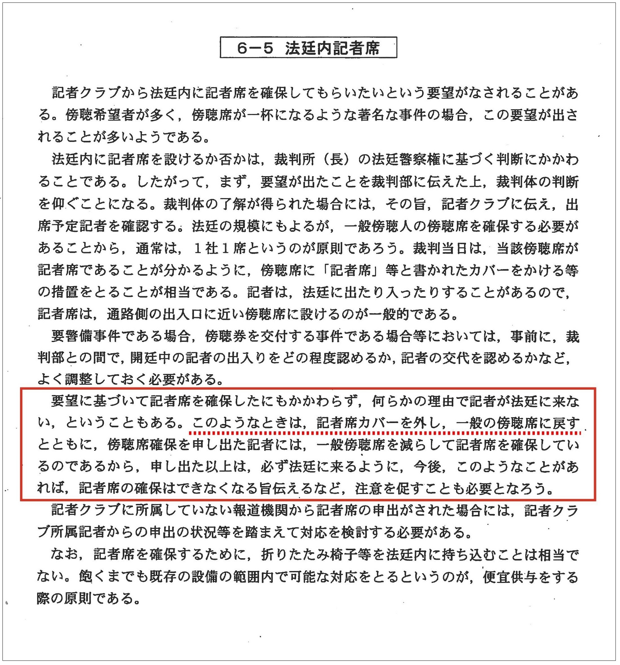 《要望に基づいて記者席を確保したにもかかわらず、何らかの理由で記者が法廷に来ない、ということもある。このようなときは、記者席カバーを外し、一般の傍聴席に戻すとともに……(以下略 》(*下の画像。赤い囲みは筆者)