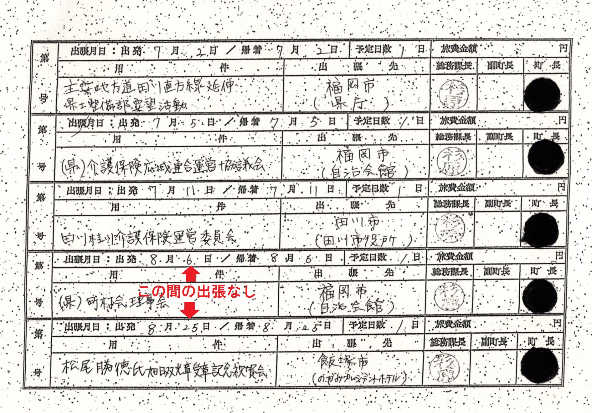 だが最大の問題は、永原氏のセブ島行きが、「公費出張」ではなく「業者を伴う私的な旅行」だったという点にある。同町への開示請求で得た永原町長の出張記録によると、セブ島派遣が実施された昨年8月の永原町長の公的な出張は2回。8月6日に福岡市、8月25日に飯塚市に出向いている。