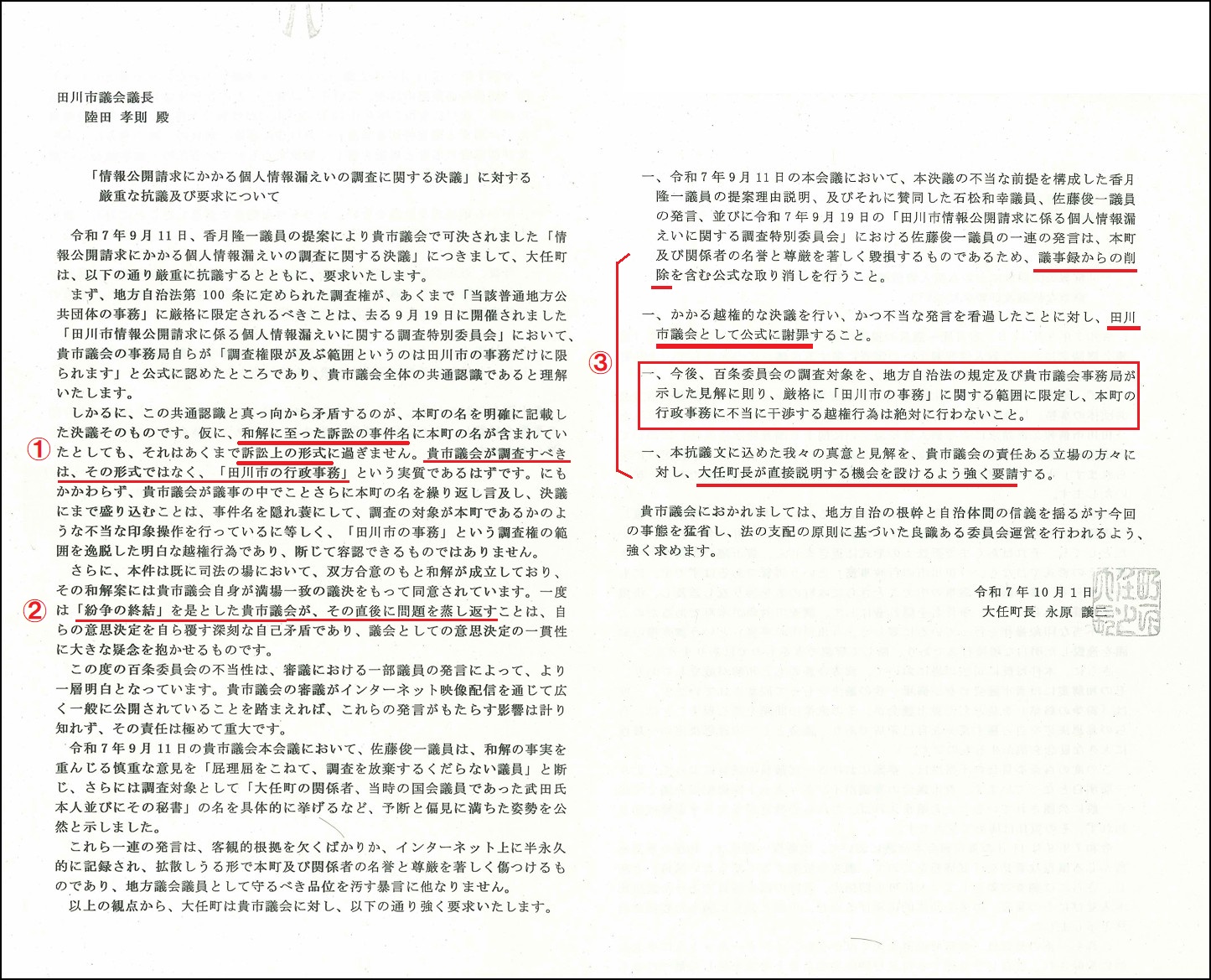 百条委の冒頭、田川市議会の議員から永原町長が発出した文書の内容について意見を求められた。町長の言い分を要約すれば、市議会が百条委設置を決めた際の決議文に「大任町」の名称が出てくるのはけしからん、議事録から関係個所を削除して謝罪しろというもの。当日の質疑で「大任町」という固有名詞に触れることが確実だった参考人に、迷惑が掛からないか心配しているとした上で、その点についてどう考えるかという質問者の問いかけだった。