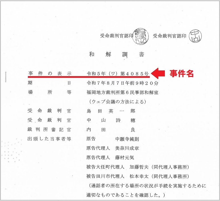 一般的に「事件名」と呼ばれているのは、裁判所が判決などの関係文書に示す『事件の表示』にある記載を指す。ハンターが訴えた情報漏洩事件における「事件名」は、下の和解調書の『事件の表示』に記されている《令和5年(ワ)第4085号》のこと。どこにも自治体名は出てこない。裁判のことをよく知らない人の作文ということだ。