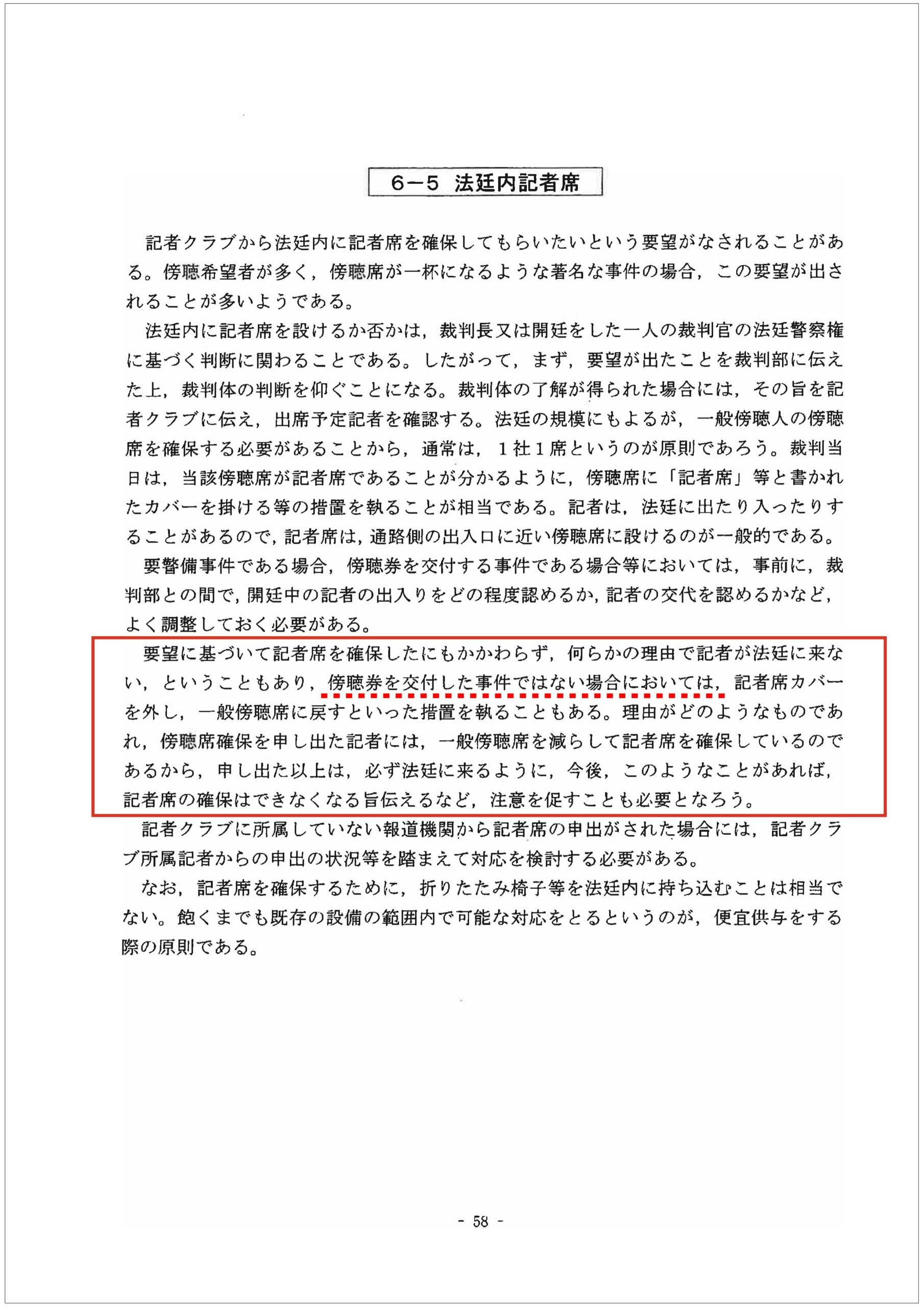 《要望に基づいて記者席を確保したにもかかわらず、何らかの理由で記者が法廷に来ない、ということもあり、傍聴券を交付した事件ではない場合においては、記者席カバーを外し、一般の傍聴席に戻すといった措置を執ることもある(以下略 》