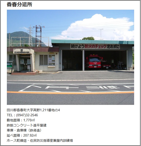 これまで大任町には消防本部の支所などはなく、現在付近で稼働しているのは隣の香春町にある「香春分遣所」である(*下の画像:消防本部のホームページより)。