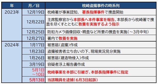 まず、時系列の中の23年12月22日付の記述。首席監察官が県警本部長に事案を報告したことになっているが、これは現職警官が犯行に関わっていることが分かったからだ。犯人が現職警官でなく一般人であるなら、よほど大きな事件でもない限り本部長への報告は必要ない。しかも報告したのは「警察の警察」と言われる監察の、それもトップ。事態を重くみていた証拠だろう。この段階で、枕崎署や県警幹部は犯人が現職警官であることを把握していたことになる。通常なら、ここから「本部長指揮」だが、そうなっていない。