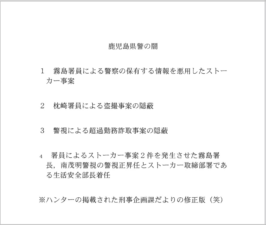警察組織内の不祥事を隠蔽したとなれば一大事。間違いなく本部長の首が飛ぶ。警察組織としては「公益通報」を認めるわけにいかない。あわてた県警は、「鹿児島県警の闇」に記された4項目についての対処方針を決める。