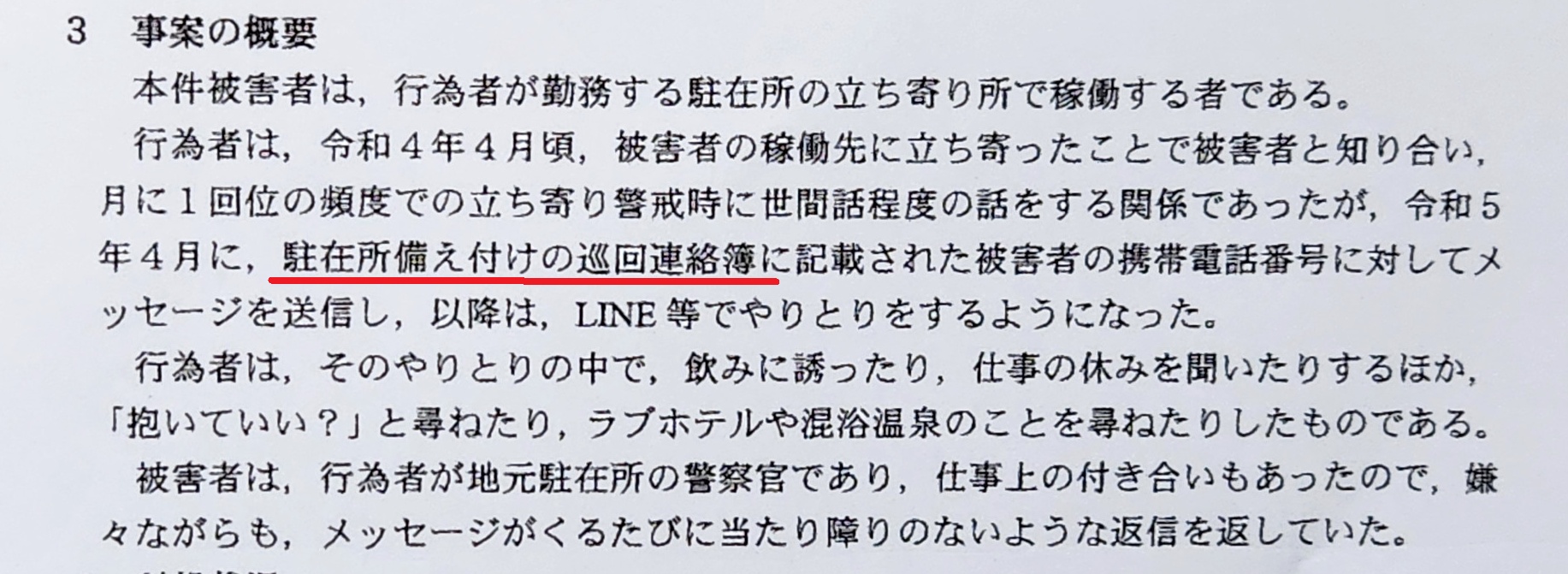 盗撮した巡査長(当時)は2022年4月、パトロール中に立ち寄った事業所で一般の20歳代女性と知り合った。当初は月に一回程度の巡回の際に世間話をする程度の関係だったが、およそ1年を経た頃から、個人的にLINEのやり取りをする間柄になる。それを可能にしたのは、巡査長が駐在所の巡回連絡簿から不正に入手した女性の個人情報だった。