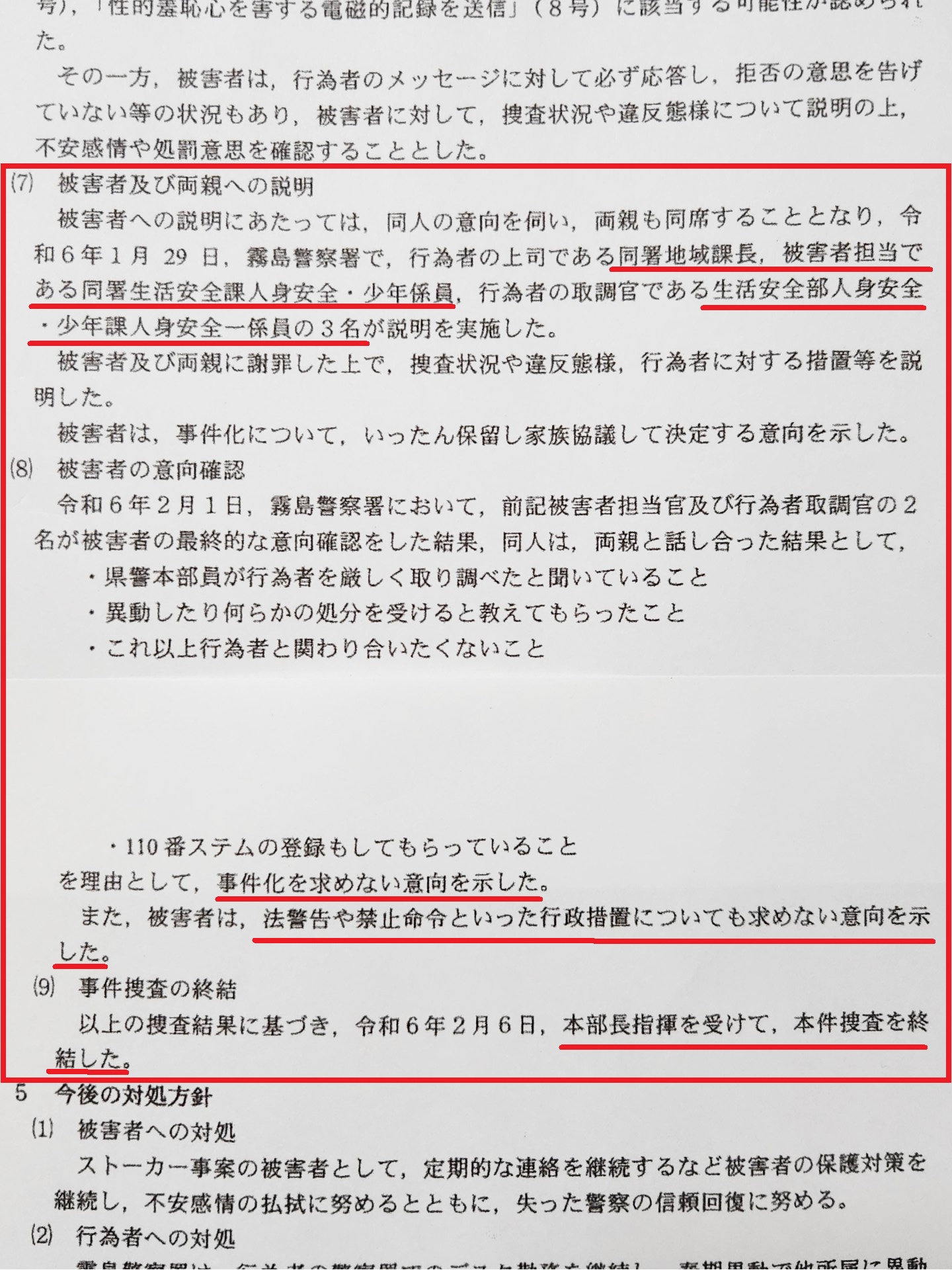 ところが、この訪問からさほど時間を経ていない2月上旬、立件されないまま捜査は唐突に終了する。被害女性が事件化を望まない意向を示したためだという。女性の本意は判然としないが、県警にとっては“警察官による犯罪の隠ぺい”に好都合な結論だったと言ってよい。その部分について記された告発文書の原本を示す(*赤い書き込みはハンター編集部)。