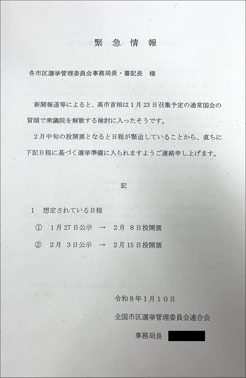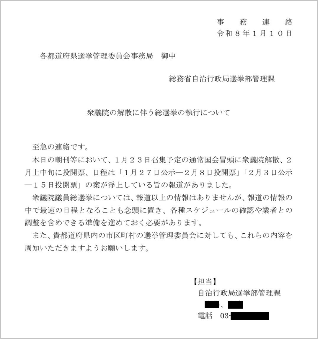 《至急の連絡》という書き出しの連絡文書には、《至急の連絡です。本日の朝刊等において、1月23日召集予定の通常国会冒頭に衆議院解散、2月上旬に投開票、「日程は1月27日公示―2月8日投開票」「2月3日公示―2月15日投開票」の案が浮上している旨の報道がありました。報道の情報の中で最速の日程となることを念頭に置き、各種スケジュールの確認や業者との調整を含めて準備を進めておく必要があります。また、貴都道府県内の市区町村の選挙管理委員会に対しても、これらの内容を周知いただきますようお願いします》とあった。