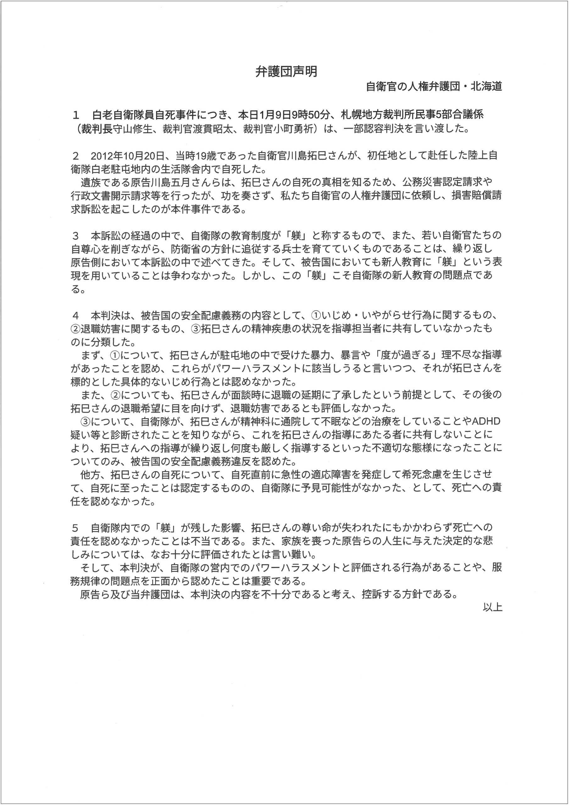 《今般の判決においては、国の主張が一部認められなかったものと受け止めております。今後の対応については、判決内容を慎重に検討し、関係機関と充分調整した上で適切に対応して参ります。いずれにしましても、陸上自衛隊としましては、隊員の心身の状態の把握に努めて参ります》