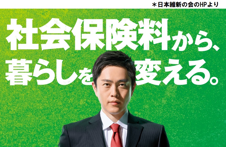 維新の政策の柱の一つは、社会保険料の引き下げだ(*下の画像参照)。大阪市議の年収だと、国民年金、国民健康保険、社会保険料の年間合計は100万円超。それを業務実態のない一般社団法人や会社を経由させ、 “架空”の収入を低く見せることで社会保険料を安くしていたというのだからタチが悪い。