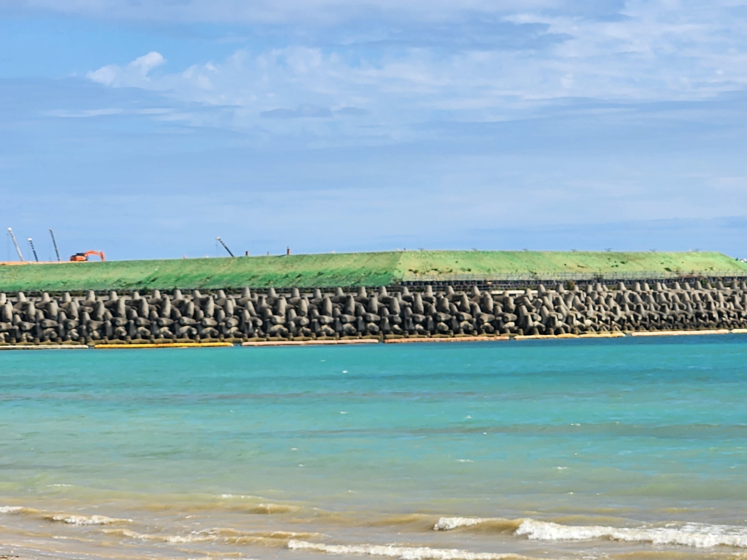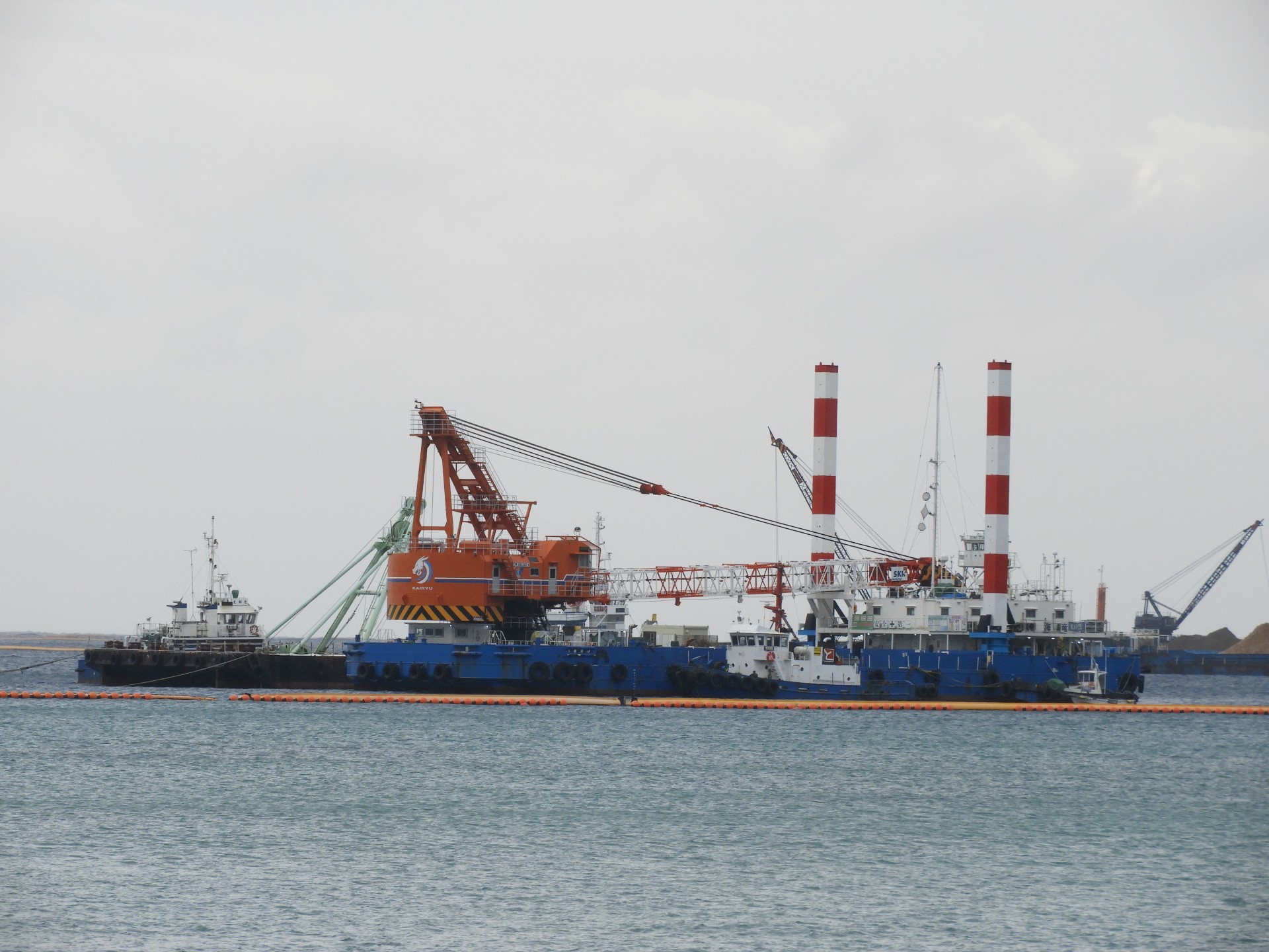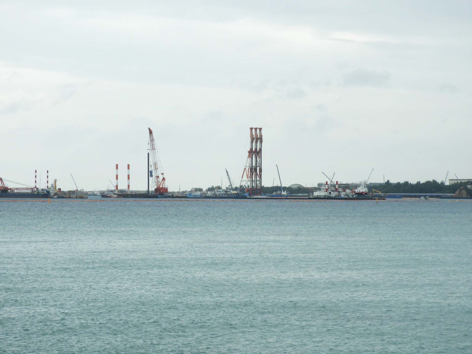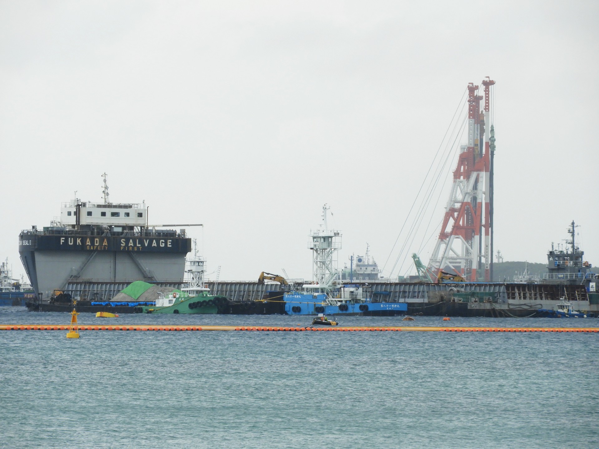 新基地建設によって埋め立てられる大浦湾では、おそらく効果がないとみられる軟弱地盤へのくい打ち作業が再開されている。