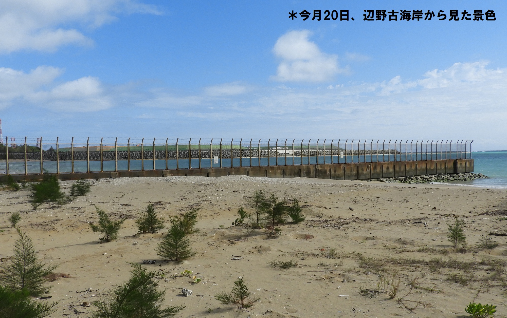 その辺野古の海だが、かつての姿はなくなった。下の写真は2014年に辺野古海岸から見た海、次が同じ場所からの海の景色。“ジュゴンが生息していた海は、二度と元に戻らない”という現実を見せつけられる。