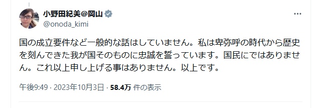「個人の自由、人格の尊厳及び基本的人権の確保が人類進歩の原動力たることを確信して、これをあくまでも尊重擁護」とある。しかし、高市早苗首相が志向するのは、個人より国家を優先する社会である。高市氏と並んで政権の顔となった小野田紀美経済安保相は、かつてSNSに「卑弥呼の時代から歴史を刻んできた我が国そのものに忠誠を誓っています」と投稿、国家主義者であることを公言している(*下の画像参照)。