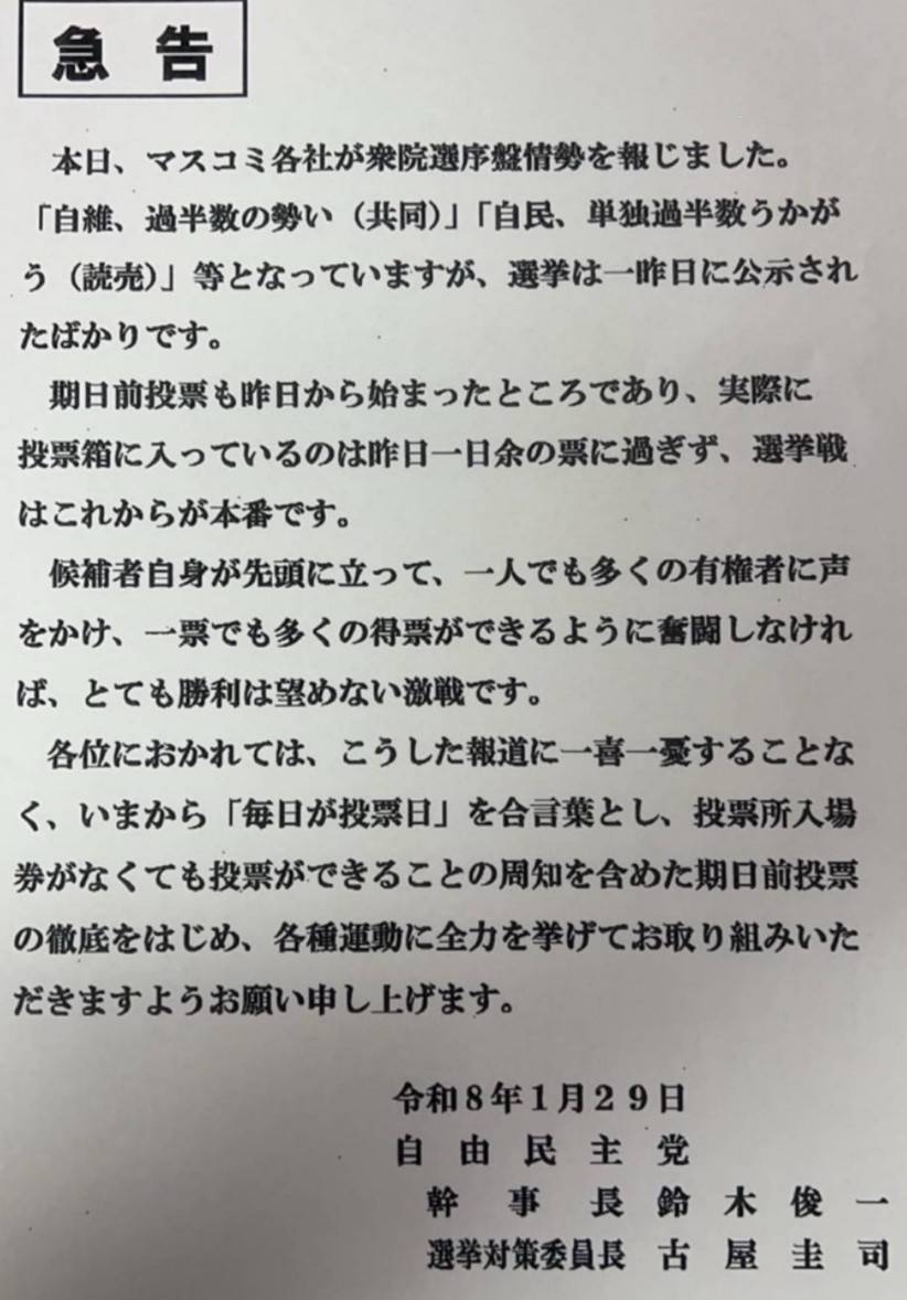各メディアの世論調査発表後、自民党は鈴木俊一幹事長、古屋圭司選対委員長の連名で《急告 本日、マスコミ各社が衆院選序盤情勢を報じました。「自維、過半数の勢い(共同)」「自民、単独過半数をうかがう(読売)」等となっていますが、選挙は一昨日に公示されたばかりです。(中略)選挙戦はこれからが本番です。(中略)各位におかれては、こうした報道に一喜一憂することなく、いまから「毎日が投票日」を合言葉とし、全力を挙げてお取り組みいただきますようお願い申し上げます》とする文書を発出、引き締めを図った。