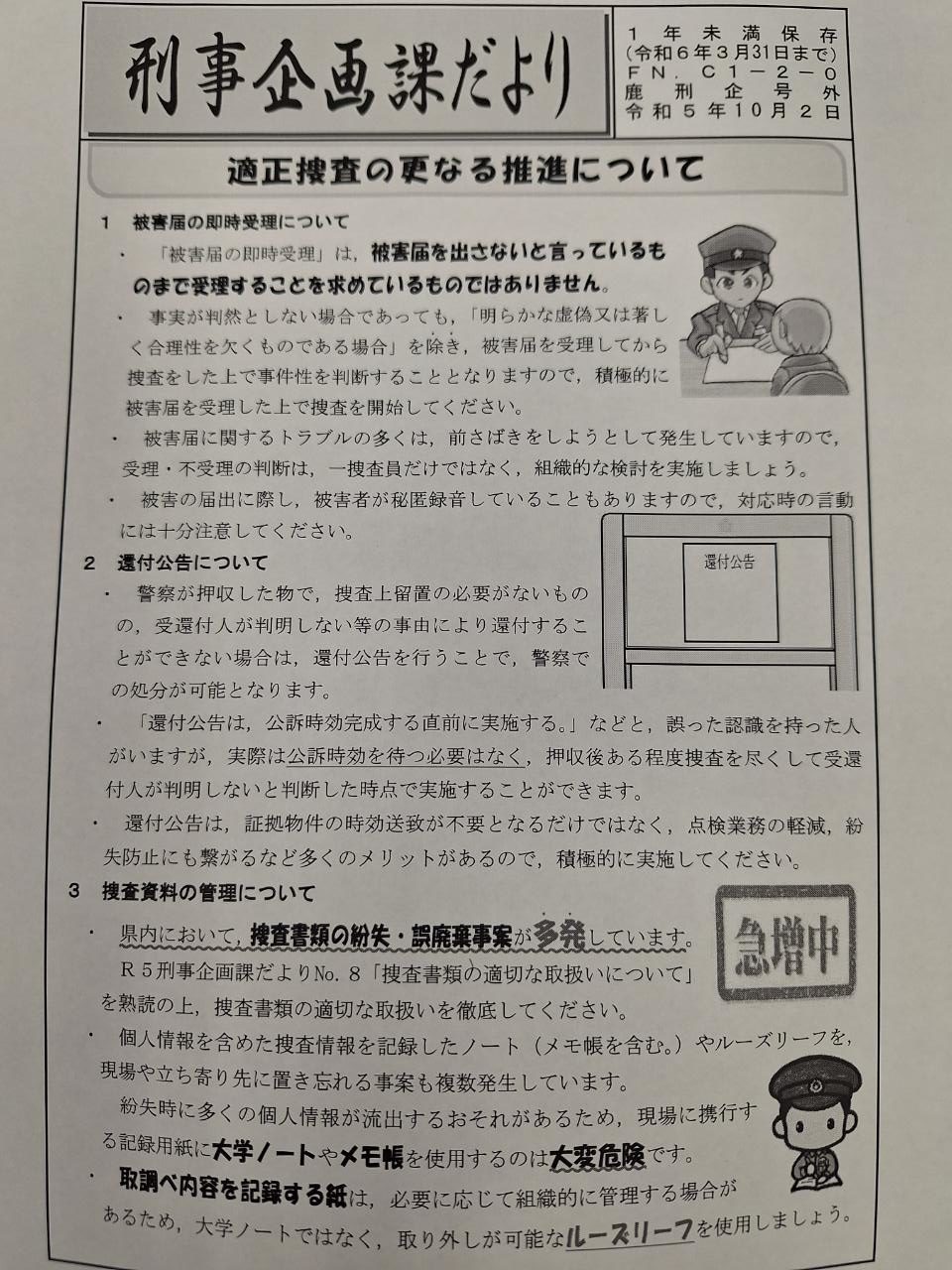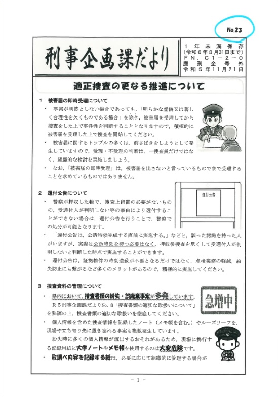 本田元生安部長が直接小笠原氏に郵送した文書の中にあったのは、前出の刑事企画課だよりNo.20とその後に出されたNo.23の、それぞれの表と裏の計4ページ。このページ数については一度も報じておらず、本田元生安部長を逮捕した鹿児島県警も「4ページ」という事実は、いまだに知らないはずだ。