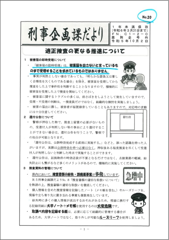 では、告発に及んだ本田元生安部長は、何を伝えたかったのか――。まず、本田元部長が郵送したNo.20の1ページ目を下に示す。彼が青い蛍光ペンで「No.20」を囲んだのは、後述する「No.23」と比較するよう促す意味があったとみられる。アンダーラインが引かれているのは冒頭の2行(*下の画像参照)。県警は、この記述を“まずい”と思ったのだろう、No.23ではこの2行だけを削除していた(*No.23の画像参照)。