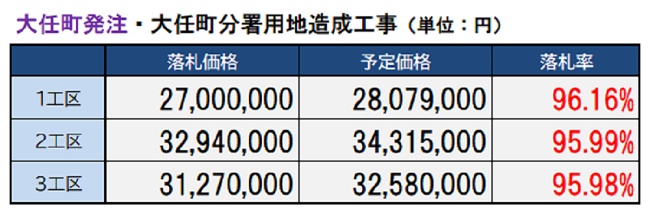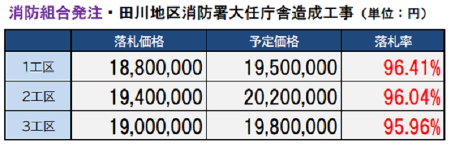 田川市・郡の8市町村で構成する「福岡県田川地区消防組合」(管理者:永原譲二大任町長)が大任町内で進める消防施設整備事業で、同町と消防組合がそれぞれ3件ずつ計6件発注した土木工事が、いずれもほぼ96%という落札率だったことが分かった。