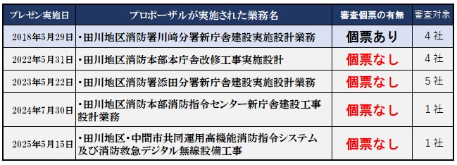 田川地区消防組合に情報公開請求して入手した資料で確認したところ、2018年から昨年までに同組合が実施した消防施設の建設及び改修のうち、プロポーザルで業者を選んだのは下の5件。このうち、2018年5月に審査が行われた「田川地区消防署川崎分署新庁舎建設実施設計業務」のプロポーザル審査を除き、「田川地区消防本部本庁舎改修工事実施設計」「田川地区消防署添田分署新庁舎建設実施設計業務」「田川地区消防本部消防指令センター新庁舎建設工事設計業務」「田川地区・中間市共同運用高機能消防指令システム及び消防救急デジタル無線設備工事」の4件については審査集計の書類があるだけで、「個票」は不存在だった。