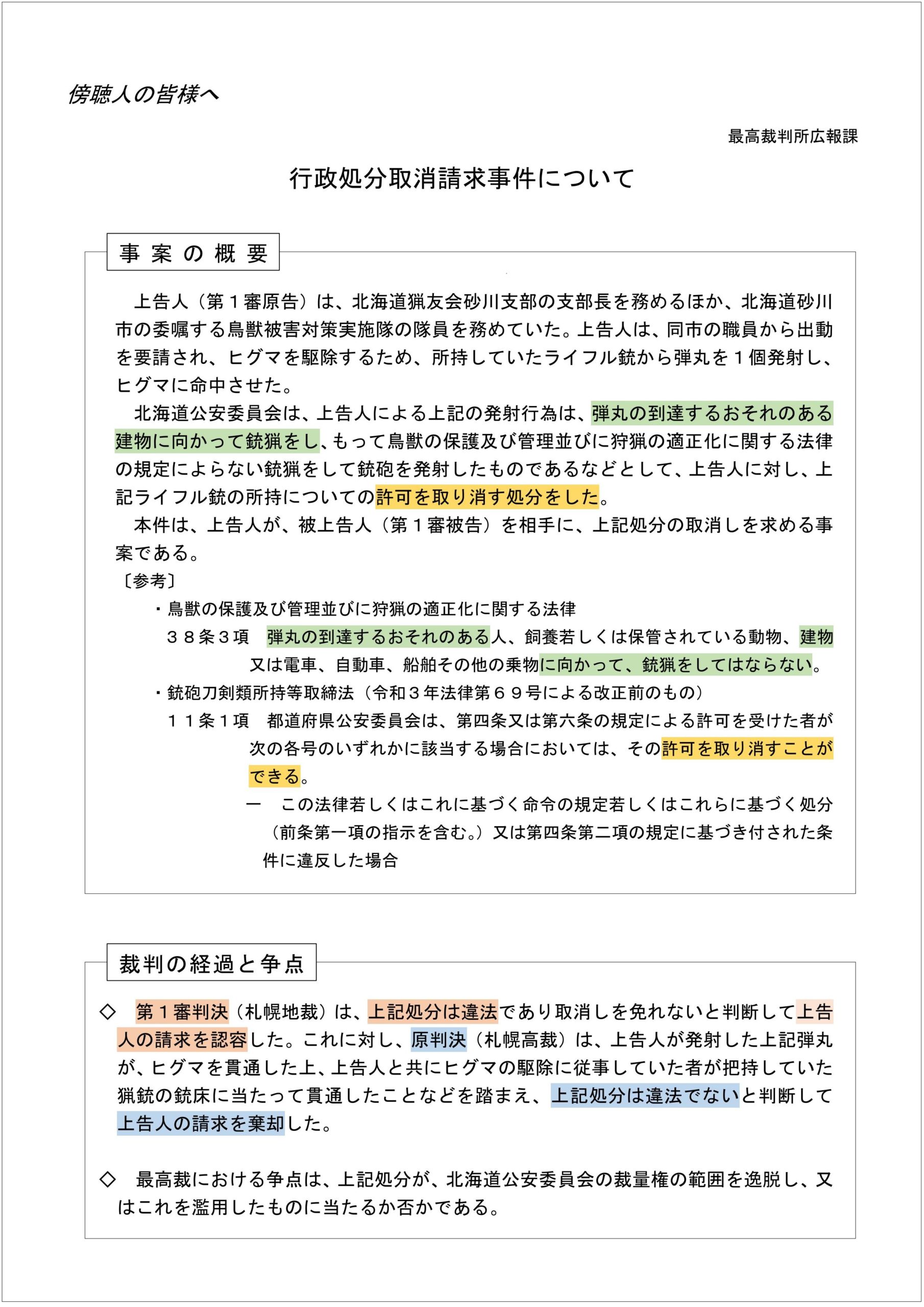 これに対し池上さん側は同10日付の書面で、高裁の判決が跳弾による「人」への抽象的な危険を必要以上に強調していると主張、そもそも公安委の処分は「人」ではなく「建物」への到達可能性を理由としたものだったと指摘した。一審が認定した裁量権の濫用については、警察の代わりに駆除を引き受けているハンターへの処分が社会に与える悪影響を考慮する必要があるとし、ハンターの社会貢献を軽視すべきではないと訴えた。