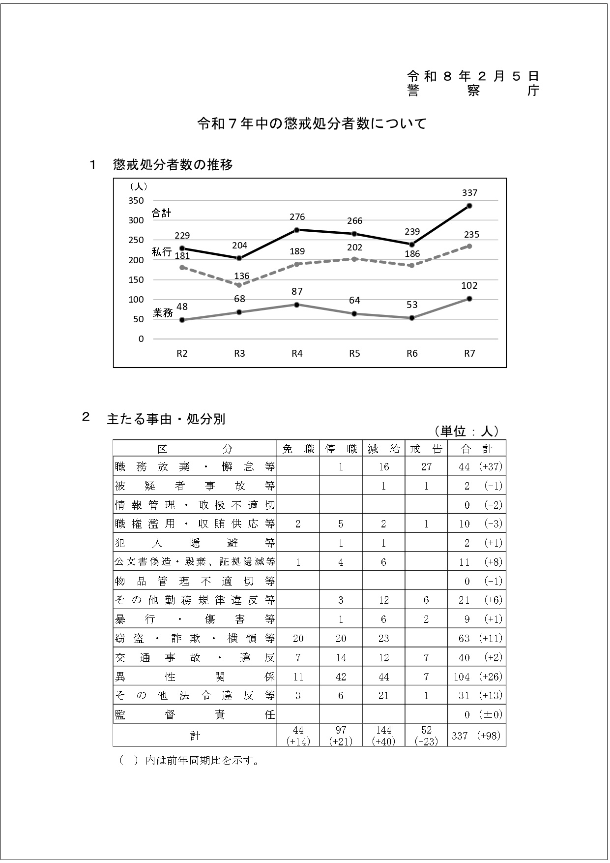 公表資料によると、2025年に全国の警察機関で懲戒処分を受けた職員の人数は337人(免職44、停職97、減給144、戒告52)。総数が300を超えるのは2014年に300件を記録して以来11年ぶりで、過去10年間で最大の数字となった。地方別では北海道15、東北19、警視庁30、関東80、中部25、近畿90、中国18、四国8、及び九州46の結果となり、残る6件は中央官庁としての警察庁で記録された。