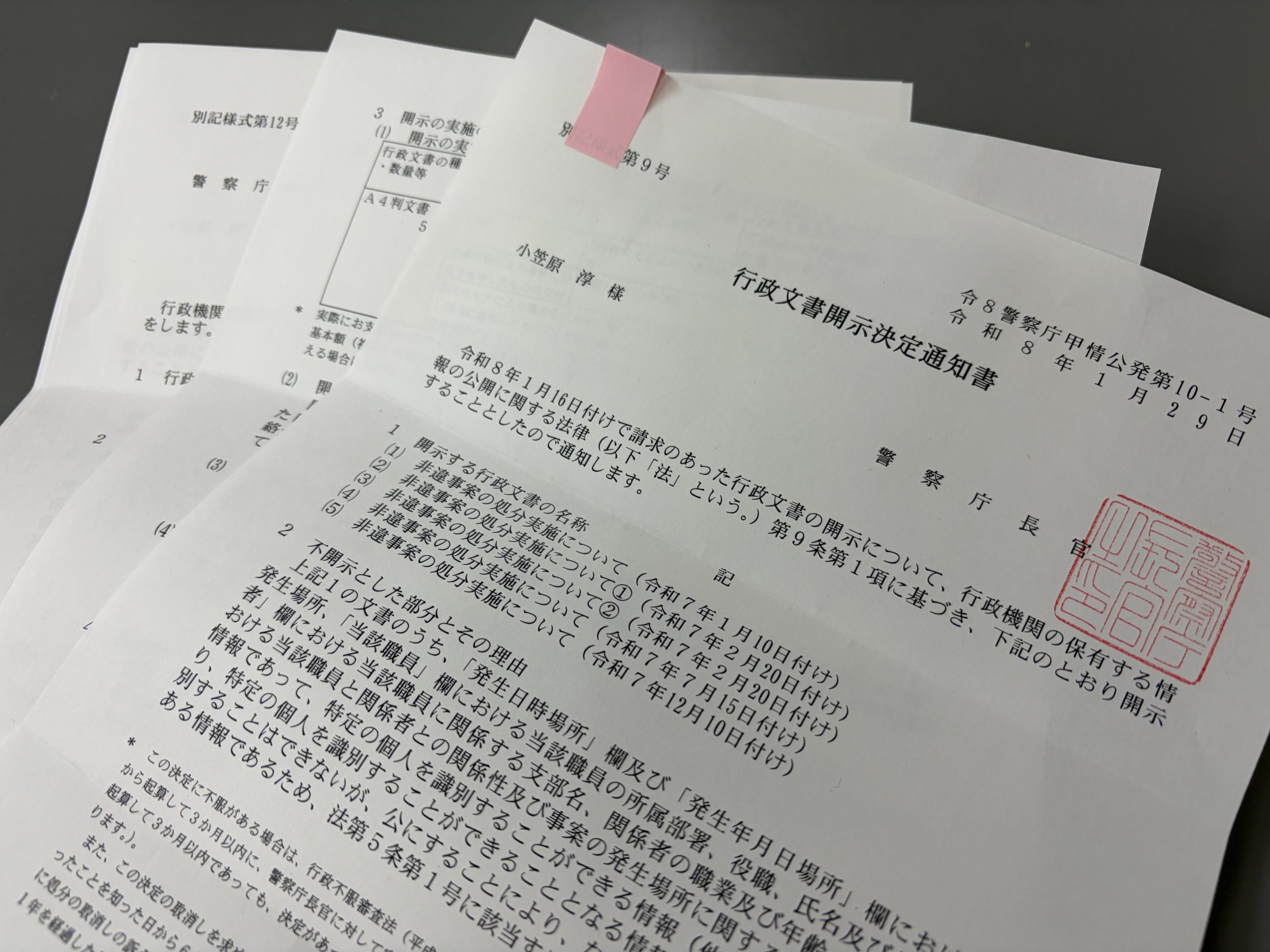 警察庁関係6件の内訳は、減給5件及び戒告1件。ここまでは当局が自ら発表した資料から確認可能だが、6件がそれぞれどういう事案だったのかは情報公開請求の手続きを経ない限りわからない。筆者は先の「11年ぶり300超え」を事前に把握できていたわけではないが、懲戒処分の記録についてはたまたま年明けに警察庁へ公文書開示請求を行なっていた。