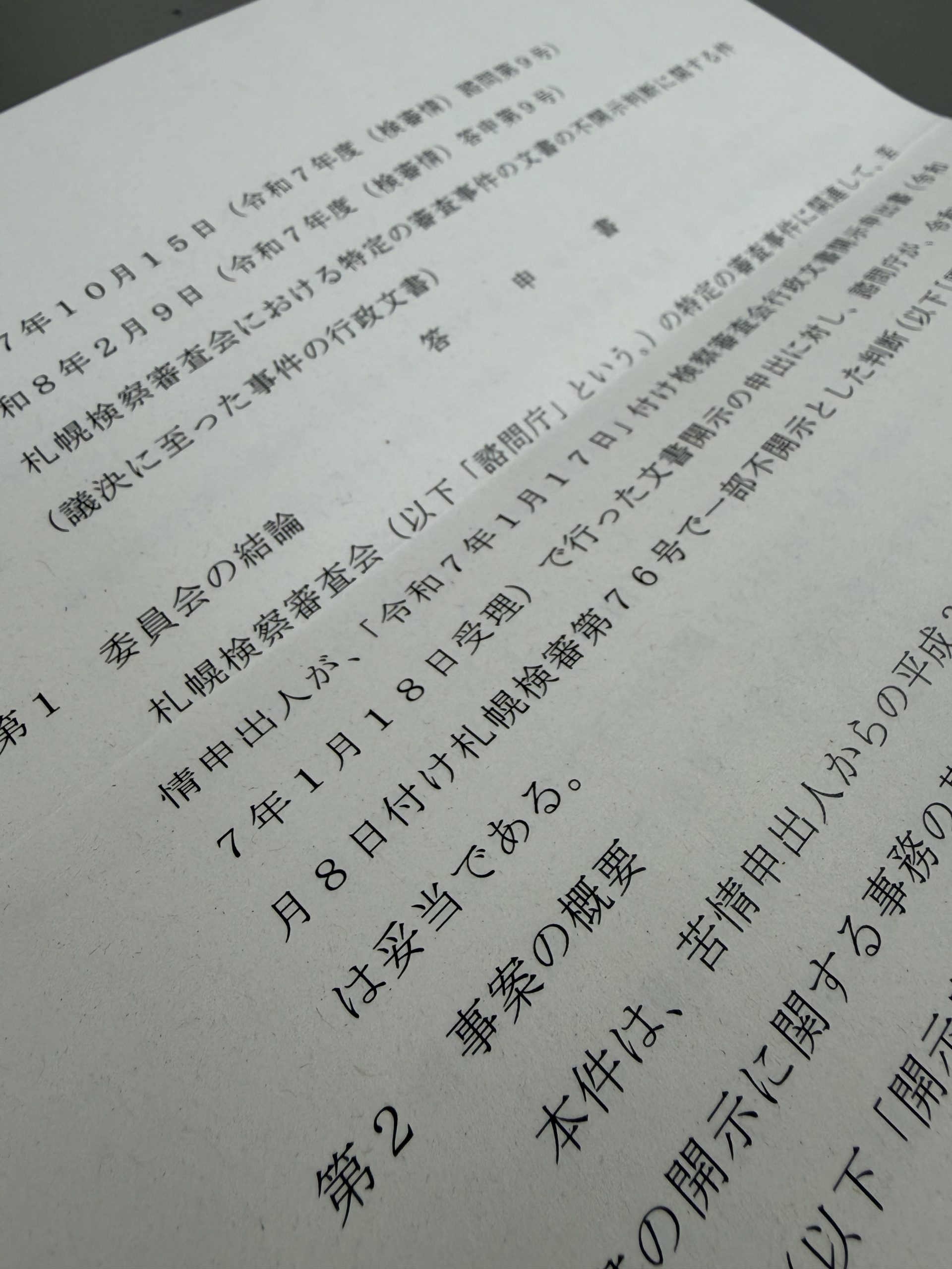 検察の不起訴処分の妥当性を審査する検察審査会が審査事件の議決などを情報公開の対象としていない問題で2月上旬、筆者の苦情申出(審査請求)を受けた第三者機関が検審の不開示決定を支持する答申を出していたことがわかった。北海道内7カ所の検審の決定に係る審査の答申はいずれも2月9日付で、各答申書の写しが同17日に筆者のもとへ届いた。