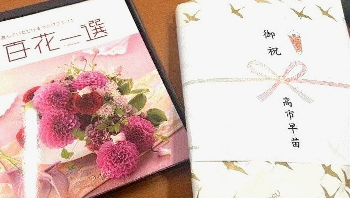 ハンターもカタログギフトの写真を入手。熨斗(のし)にはしっかり「御祝 高市早苗」と記されていた。自民党の支部による寄附との釈明とは明らかに矛盾している。