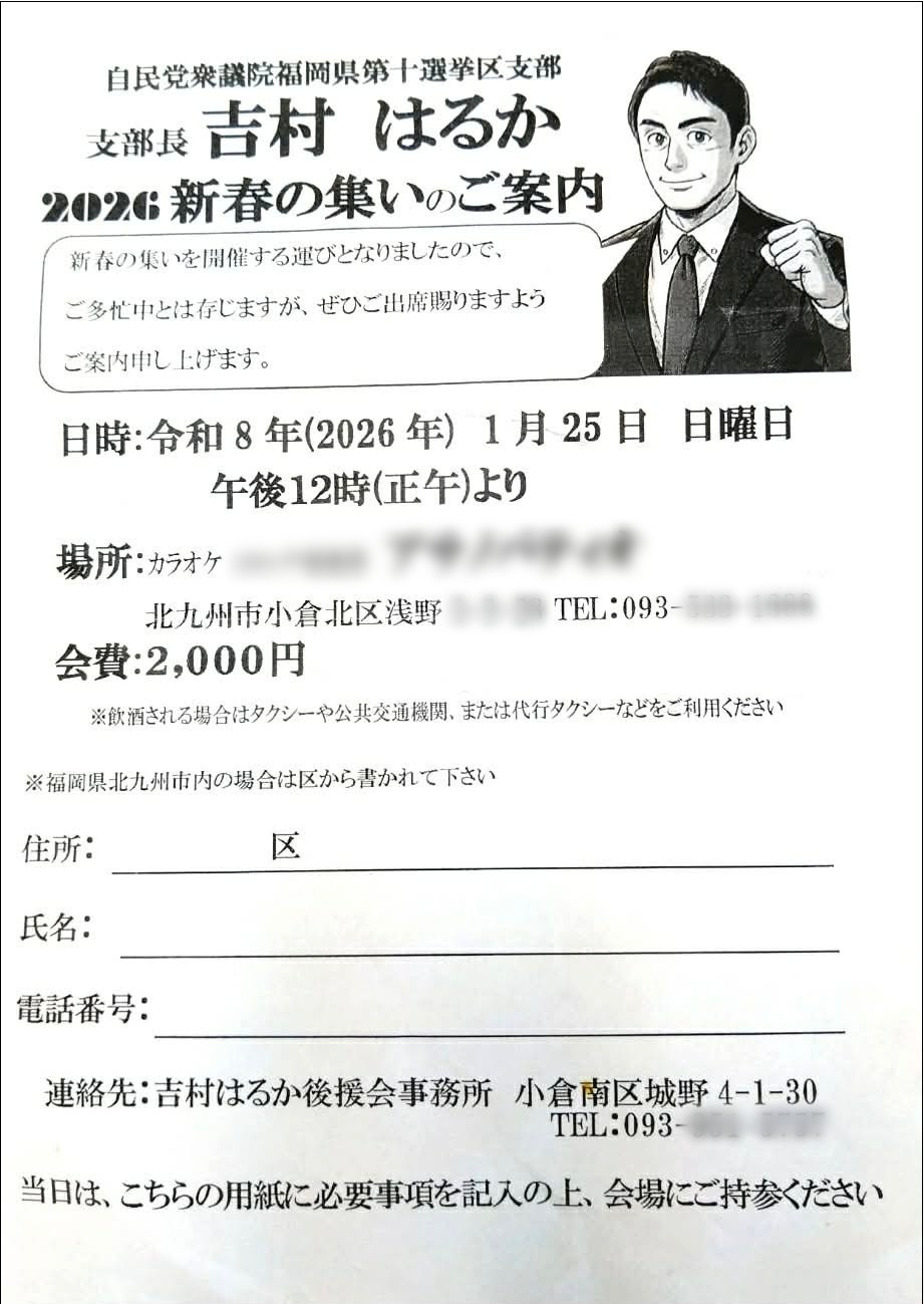 「買収されたと思われたくなかったので参加しなかった。会費より高い金額の料理を出すというんだから、危ないに決まっていた」――そう語るのは、福岡10区内に住むある男性。 手にしているのは《自民党衆議院福岡第十選挙区支部 支部長 吉村はるか 2026 新春の集いのご案内》と記されたチラシだ。