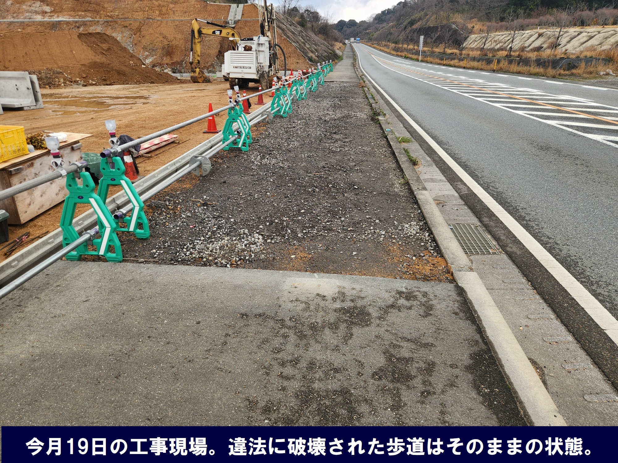 異変が起きたのは今年2月。突然、国道沿いの歩道が剝がし取られ、安全確保のための仮歩道もない状態に――。ハンターの記者が現状を把握した同月末頃から今月20日過ぎまで、下の写真の状態で工事が止まったままとなっていた。
