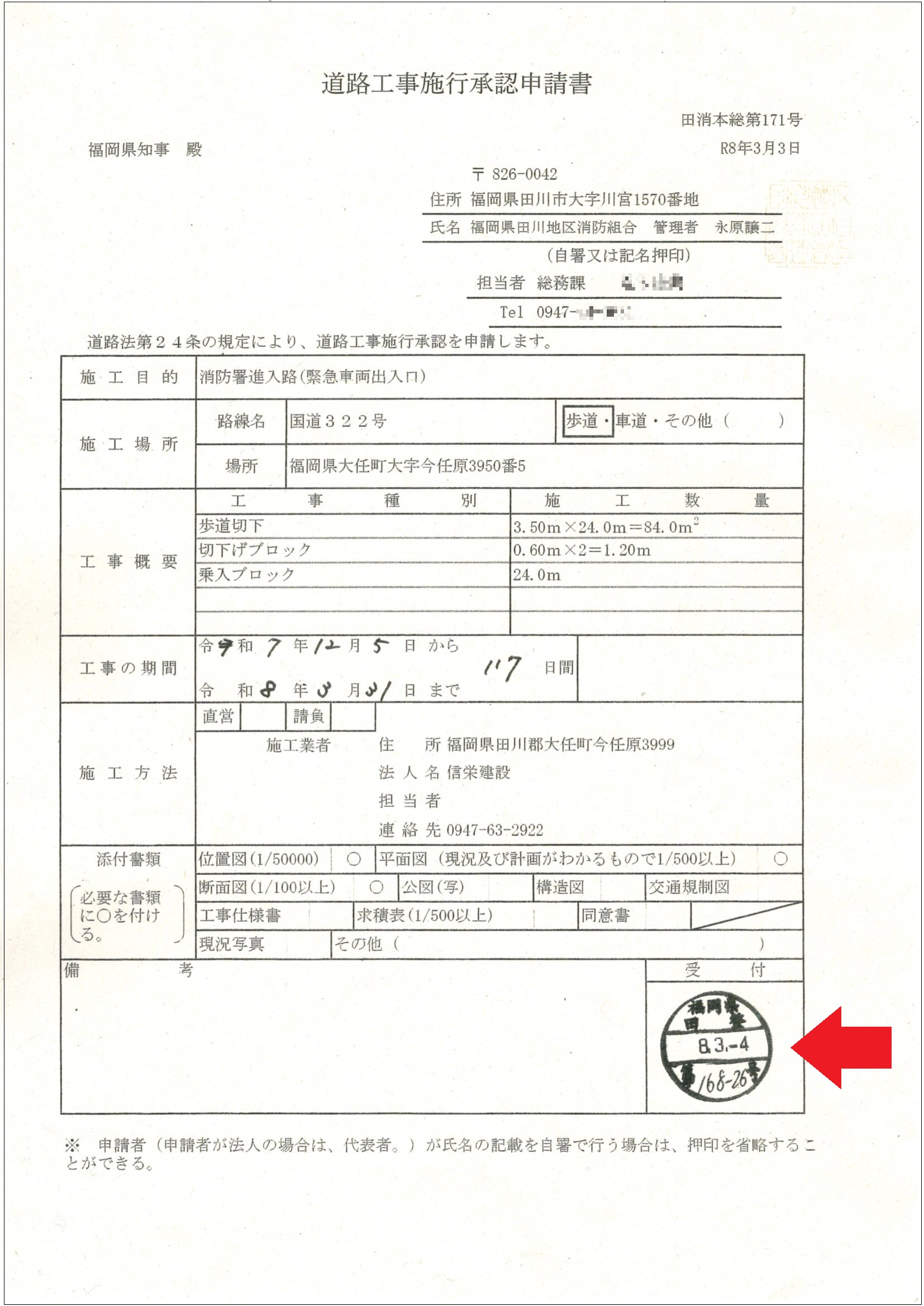 ハンターは今月15日、県に対し同工事で提出された申請書などを情報公開請求。26日開示された下の文書で、承認申請が実際の歩道破壊より後の「3月4日」であることを確認した(*赤い矢印はハンター編集部)。