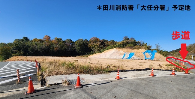 上掲の写真は昨年の11月末。組合に消防庁舎用地を提供した大任町が、1期目となる造成工事を独自に行った直後の現場の様子だ。この時は歩道が健在(*上の写真の赤い囲み部分)。歩道に沿ってカラーコーンが並んでいた。